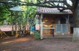 -Espaço externo com forno caipira e uma mesa de mármore
