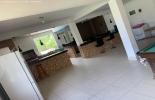 Salão de festas com aproximadamente 100 m² com mesa de sinuca e pebolim, 2 geladeiras e 1 freezer, mesa de madeira maciça com 2 bancos grandes,